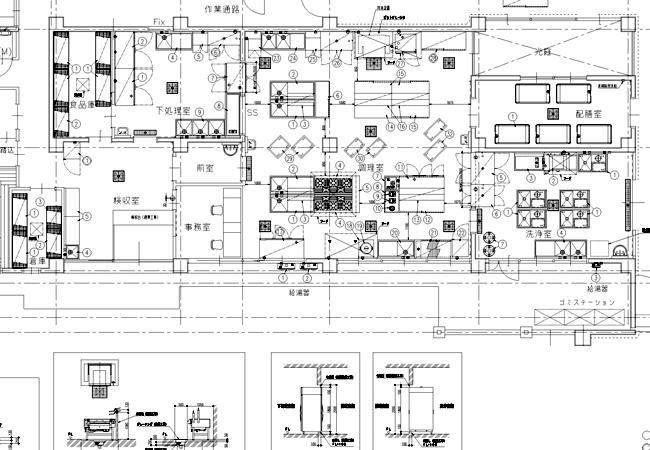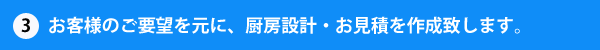 お客様のご要望を伺いながら、仕様・スペース 動線・ご予算に合わせた厨房機器を選定し、 レイアウトを作成。 その後、お客様との打合せを重ねながら 厨房平面図・立体図を作成します。 この時点で図面を元に、 お見積りも作成いたします。 提案図と御見積りで、 この世に一つのお客さまだけの オリジナル厨房をご提案いたします。 |